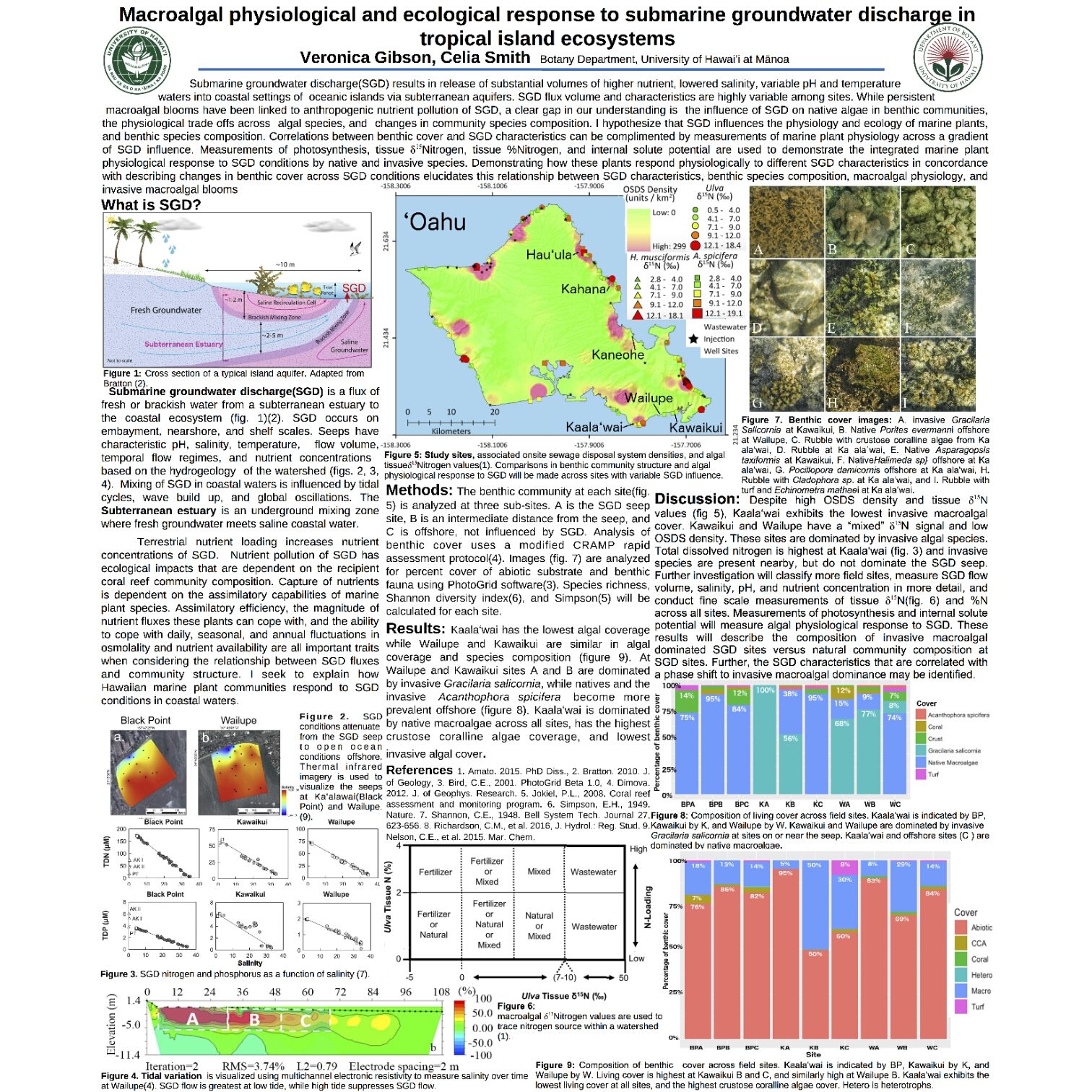 Initial characterization showed that invasive species “gorilla ogo” (Gracilaria salicornia) and the “spiny seaweed” (Acanthophora spicifera) are particularly abundant in nearshore spring conditions found at Waiʻalae ʻIki, near Wailupe Beach Park on Oʻahu’s south shore. Yet, native limu maneʻoneʻo (Laurencia dendroidea) and a presumed introduction and close relative of limu manauea, Gracilaria perplexa, were sparse. Why are these natives less common in the nearshore spring region of Waiʻalae ʻIki, a native habitat?