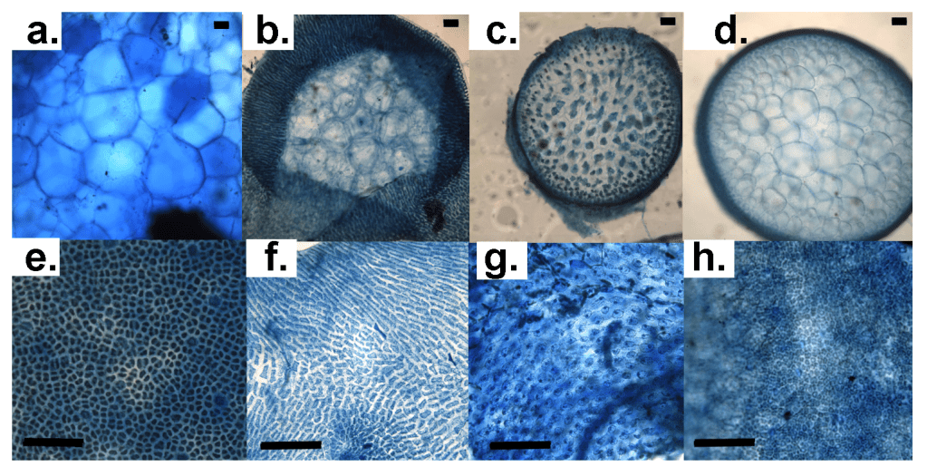 Microscopy examined cell tissues for all study species and found that the two invasive species had thinner cell walls in spring influenced conditions, while only gorilla ogo had smaller cells in the same conditions. Scale bar (black rectangle) for all photos is 10 µm long. White bar labeled “MCD” indicates an example medullary diameter measurement. Medullary cross sections a-d; a. Gracilaria salicornia, b. Acanthophora spicifera, c. Laurencia dendroidea, d. Gracilaria perplexa. Cortical surfaces e-h; e. Gracilaria salicornia, f. Acanthophora spicifera, g. Laurencia dendroidea, h. Gracilaria perplexa.